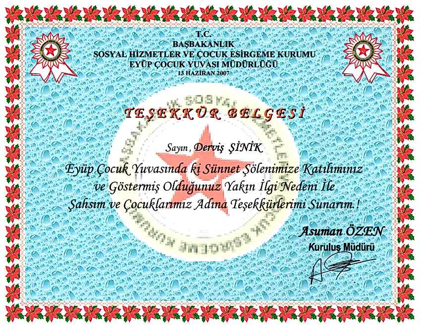 | DERVİŞ HOCANIN EYÜP ÇOCUK YUVASI MÜDÜRLÜĞÜNDEN ALMIŞ OLDUĞU TEŞEKKÜR BELGESİ | DERVİŞ HOCA İZZET BAYSAL HUZUR EVİ MÜDÜR YRD. ÖDÜL ALIRKEN |