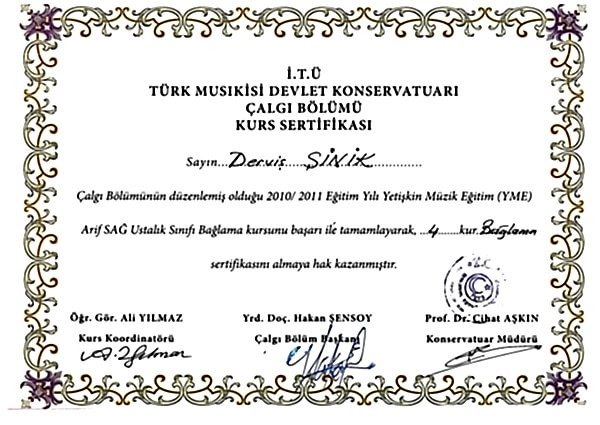 DERVİŞ HOCA Bağlama'yı, yıllarını Türk Halk Müziği'ne vermiş bir derviş' ten öğreneceksiniz. Telli çalgıların atası sayılan bağlamaya ve Türk Halk Müziğine yıllarını vermiş olan Derviş ŞİNİK 1957 yılında Elazığ'da doğdu. 1975-1977 yılları arasında Kasımpaşa'da bağlama yapım ustası olarak bilinen Ömer GÖK'ün yanında çalışmaya başladı. Öğreniminin ilk yıllarından itibaren müziğe ve bağlamaya ilgi duyan Derviş ŞİNİK 1980- 1986 yılları arasında Devlet Konservatuarında ilk müzik eğitimini tamamladı. 1983-1986 yılları arasında Ahmet Gazi Ayhan ile tanışıp çalışmalar ve çeşitli araştırmalar yaparak Türk Halk Müziğine katkıda bulundular. Hemen ardından Kadıköy Halk Eğitim Merkezi'nde bağlama ve koro çalışmalarına katıldı ve beraberinde Türk Folklor Kurumuna çeşitli çalışmalarıyla katkıda bulundu. Film-San'a üye olan Derviş ŞİNİK birçok filmlerde de rol almıştır. (Debreli Hasan, Azap Çiçeği, Akşam Güneşi …) Derviş ŞİNİK 2002 yılında şahsına ait Sarıyer Ferahevler semtinde bulunmakta olan Türkü Müzik Merkezi'ni kurdu. 2005 yılında Mor Menekşe adlı dergisinde müzik üzerine röportajı yayınlanan Derviş ŞİNİK , 2006 yılında Kabataş Ticaret Meslek Lisesi'nde ve İzzet Baysal Huzurevi'nde vermiş olduğu konserlerden dolayı Teşekkür Ödülleri bulunmaktadır. 2007 yılında 22 Mart Yaşlılar Haftası dolayısıyla Darülaceze'de verdiği konserde de İçişleri Bakanlığı tarafından ödüle layık görülmüştür. Yine 13 Haziran 2007'de T.C. Başbakanlık Sosyal Hizmetler ve Çocuk Esirgeme Kurumu adına hazırlanan konserde Eyüp Çocuk Yuvası teşekkür plaketi almıştır. Derviş ŞİNİK ve yetiştirdiği öğrenciler Türkü Müzik Merkezi olarak Sarıyer Belediyesi'nin, Sarıyer İstinye Eski Tersane alanında düzenlediği Ramazan etkinliklerinin konserlerinde de yer almaktadır. Son olarak İ.T.Ü (İstanbul Teknik Üniversitesi) Türk Musikisi Devlet Konservatuarı Çalgı Bölümü'nün düzenlemiş olduğu 2010 / 2011 Eğitim Yılı Yetişmiş Müzik Eğitim (YME) Arif Sağ Ustalık Sınıfı Bağlama kursunu başarı ile tamamlayarak sertifika almaya hak kazanmıştır. Derviş ŞİNİK halen Türkü Müzik Merkezi'nde eğitim vermeye devam etmektedir. Saygılarımla Derviş ŞİNİK