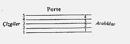 PORTE: Bir musiki eserini dinlediğimiz zaman o eserin tizlik veya pestlik bakımından birbirinden farklı seslerden meydana gelediğini duyarız. İşte bu tizlik ve pestlik farklarını belirtecek şekilde notaların yazılmasına (isimlerinin belirlenmesine) yarayan, yatay durumda birbirinden eşit uzaklıkta beş paralel çizgi ve dört aralığa porte denir. Portede çizgi ve aralıklar aşağıdan yukarıya doğru sayılır.