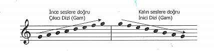 GAM (Dizi): Herhangi bir notadan başlayıp inici veya çıkıcı olarak sekiz komşu notanın hiç kopmadan sıralanmasına gam denir. Gamlar pestten başlayıp tize doğru sıralanıyorsa çıkıcı, tizden başlayıp pestte doğru sıralanıyorsa inici gam adını alır. Batı müziğinde her gam başladığı notanın ismini alır (Çıkıcı DO gamı, inici RE gamı gibi). Gamlar çıkıcılık veya inicilik hakkında bir şey söylenmezse, her zaman çıkıcı gam anlaşılır. Gam yerine bugün DİZİ adı kullanılmaktadır.