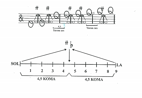 F- Donanımı: Sanat Müziğinde donanımına Sİ için koma bemolü (1 koma), FA için bakiye diyezi yazılır. Halk Müziğinde ise Sİ perdesi bemol 2 ile gösterilir. FA perdesi için bakiye diyezi konulur.