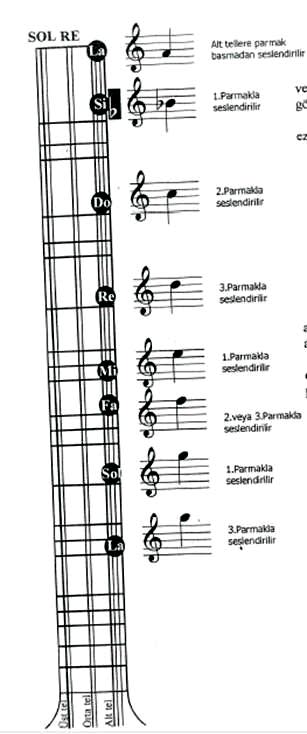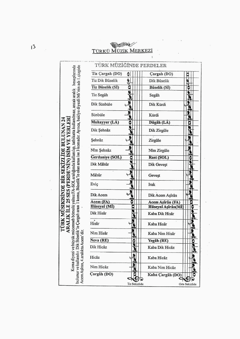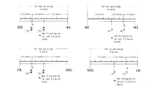 G- Perdelerin adları: Dügah (LA), Segah "Sİ bemol, 1 koma" (Bu perdenin arz ettiği özellik yukarıda anlatılmıştır), Çargah (DO), Neva (RE), Hüseyni (Mİ), Acem (FA), Gerdaniye (SOL) ve Muhayyer (LA) dır.