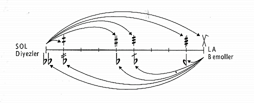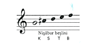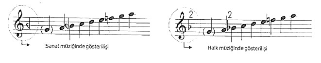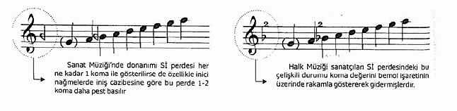 F- Donanımı: Sanat Müziğinde donanım 1 koma Si bemol işareti ile gösterilir. Halk müziğinde ise Sİ bemol 2 ile ifade edilir.