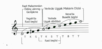 1- Uşşak makamı çıkıcı, ağır başlı ve dini duygular uyandıran bir makamdır. Bu yüzden, makamın ağır başlılığının bozulmaması için genişlemesi, daima dizinin pest tarafından durak altından yapılır. Bu da Yegah (RE) perdesinde bir Rast beşlisi oluşturmakla elde edilir. Bu genişleme de (FA diyez) Irak perdesi diziye yabancı bir sestir. Ana dizide böyle bir ses yoktur. Esasen Yegah 'taki Rast çeşnisi de diziye yabancıdır. Fakat önceden biliyoruz ki, Uşşak dörtlüsünün karar perdesinin bir Tanini altında rast beşlisi meydana gelir. Yani bu iki çeşni iç-içedir. İşte Irak perdesi ve Yegahtaki Rast çeşnisi Uşşak-Rast arasındaki bu yakınlıktan meydana gelmiştir ve adeta-Rast makamından alınmıştır.