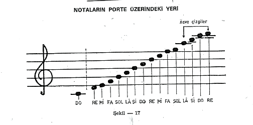 İLAVE ÇİZGİLER: Portenin beş çizgi ve 4 aralığına ancak dokuz nota yazılabilir. Buna portenin en altına ve en üstüne yazılan iki notayı da ilave edersek, bu sayı ancak on biri bulur. Yani porte beş çizgi, dört aralığı ile bize on bir notanın ismini belirleme imkanı verir. Halbuki herhangi bir müzik eserinde, özellikle saz eserlerinde on bir sesten daha fazla ses kullanılabilir. Veya herhangi bir müzik eseri dizisi gereği daha tiz, yahut daha pest bölgelerde gezinebilir. İşte bu notaları yazabilmek için portenin altına ve üstüne kısa çizgiler konur. Bu çizgiler, gerek alttan gerekse üstten eldeki porteye yaklaştırılan ikinci ve üçüncü portenin, yazacağımız tizlik ve pestlikteki seslerin gerektirdiği kadar olan çizgilerdir. Bu duruma göre esas portenin on beş çizgili olduğu ortaya çıkıyor. Fakat birbirini takip eden on beş çezgilik bir porte üzerindeki notaları okumak tamamen imkansız olduğundan, bu portelerden ortadaki çizilir, altta ve üstteki öteki porteler sesler gerektikçe böyle ilave çizgiler halinde, kısa kısa, gerektiği sayıda gösterilir.