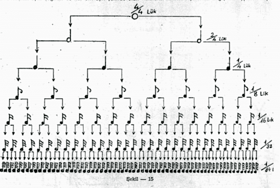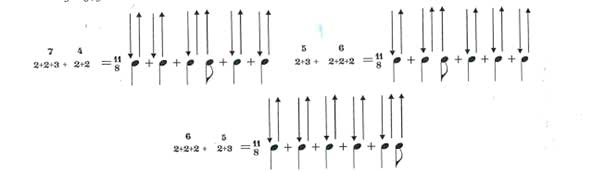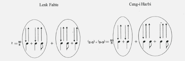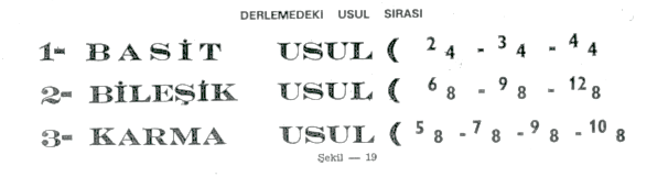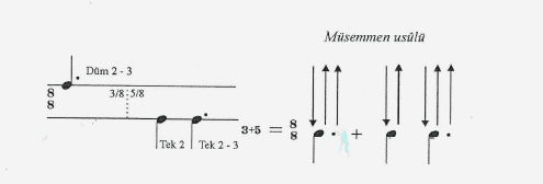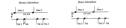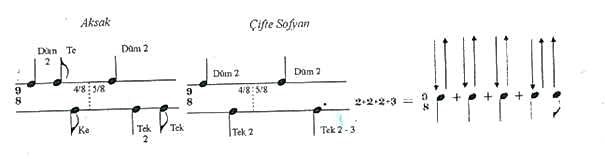 Birinci şekilde üçlü vuruş başa, ikincide ortaya, üçüncüde sona gelmektedir Bundan başka, üçlülerin senkoplu şekli bu usullerin ritim bakımından daha zengin bir duruma getirmektedir.