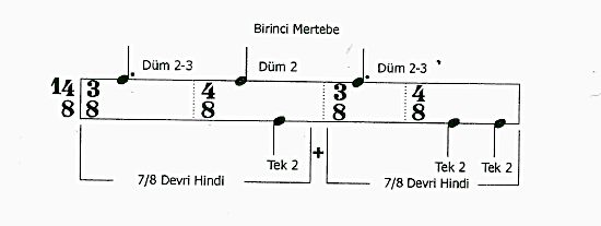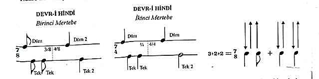 Muzaffer Sarısözen hocanın Türk Halk Musikisi kitabında açıklamış bulunduğu birleşik yedili usullerin 1. şekli ile aynı olan Devr-i Hindi. Yukarıda da görüldüğü gibi bir üç zamanlı ile 2 iki zamanın birleşimidir. (Unutulmamalıdır ki iki nim safyan bir safyan demektir.)