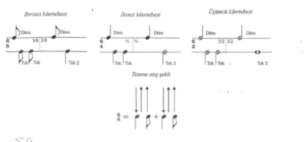 Dört ve iki vuruşlu ana usullerin veya üç vuruşlu iki ana usulün birleşmesinden çıkan birleşik altılıların, üzerinde önemle durulacak bir özelliği vardır. Denilebilir ki, altı vuruşlu bir usulü iki vuruşlu üç ölçü ile de yazabiliriz. Yahut iki tane üç vuruşluyu yine üçlü olarak yazmakla kaybedilen şey nedir.