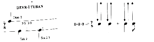Devr-i Turan usUlü ise bir dört zaman bir üç zamanın eklenmesinden oluşmuştur. Diğer bir adı da "Mandıra" olarak bilinen bu usulün 7/8'lik mertebesi kullanılmıştır. Devr-i Hindi'nin tam tersidir. 4+3= 7. Yürük bir usuldür.