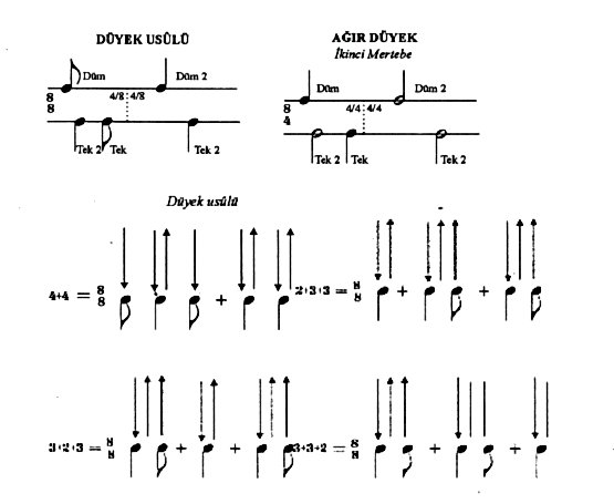 Geleneksel Türk Sanat Müziğinde Düyek, Ağır Düyek ve Müsemmen olarak bilinen 8 zamanlı usuller şöyle açıklanmaktadır.