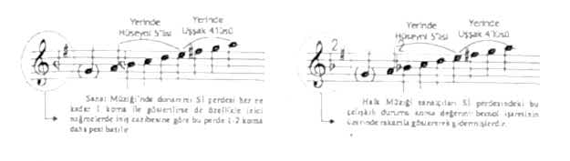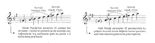 Not: Uşşak makamında Si sesi koma bemollü, yani Segah perdesi olarak görülür, fakat özellikle inici nağmelerde iniş cazibesiyle bu perde segahtan 1-2 koma daha pest basılır. Bu hal makama ayrı bir özellik ve kişilik kazandırır. 2-3 komalık değiştirme işareti olmadığı için yazıda bu perde sanat müziğinde Segah (1 koma Sİ bemol), halk müziğinde Sİ bemol 2 olarak gösterilir. İcra da daha pest basılır.