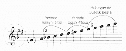 1- Genişlemesi: Güçlü Hüseyni perdesi üzerindeki Uşşak dörtlüsü, Muhayyer'de bir Buselik beşlisi eklenmesiyle, Hüseyni de Uşşak dizisi olarak uzatılır. Tiz tarafta meydana gelen çeşni içindeki Sİ sesi, Buselik perdesidir.