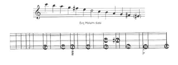 G- Perdelerin İsimleri: Halk müziğinde ismen kullanılmazsa da Hüseyni makamı dizisinde perde isimleri kalından inceye doğru; Dügah (LA), Segah (Sİ 1 koma), Çargah (DO), Neva (RE), Hüseyni (Mİ), Eviç diyez) veya Acem (FA), Gerdaniye (SOL) ve Muhayyer (LA) dır.